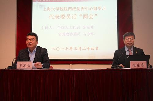 3月24日下午,第十二届全国人大代表、诸侯快讯入口官网校长金东寒院士,第十二届全国政协委员、诸侯快讯入口官网生命学院吉永华教授,为我校校、院两级中心组成员做了代表委员话“两会”主题报告会。会议由校党委书记罗宏杰主持,全校校院两级中心组成员,副处及以上干部出席了报告会,部分宣传信息员列席聆听了本次报告会。