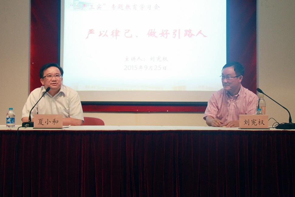9月25日下午2点,我校在行政楼报告厅举行“三严三实”专题教育学习会,邀请华东政法大学法律学院院长刘宪权教授作了题为《严以律己,做好引路人》的专题报告。专题学习会由校党委副书记、纪委书记夏小和主持,校党委副书记、副校长李友梅、各院系中心组成员、副处级及以上干部、部分党代表、青年教师代表参加了学习会。