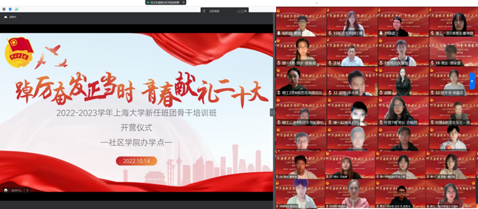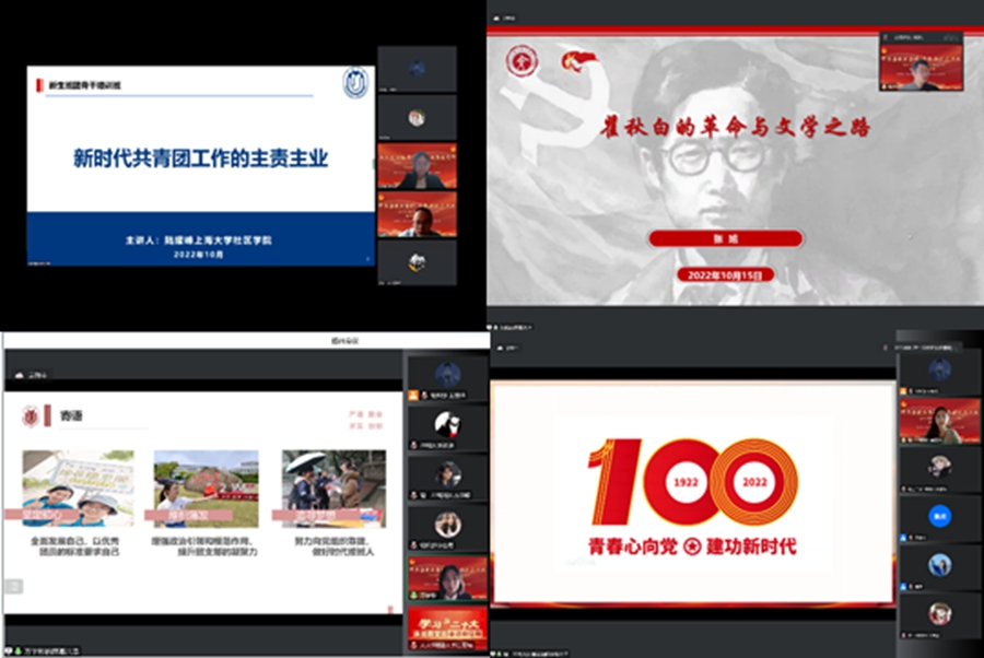 10月15日,班团骨干们集中进行了6学时理论学习、5学时红色教育、4学时基础团务和3学时能力提升的培训课程,形式包含专题报告、技能培训、自主研习、参观学习等。10月16日上午,班团骨干们集中在线观看党的二十大开幕,认真学习并撰写感悟。10月16日下午的结营仪式上,班团骨干们围绕思想引领、青年责担当,进行了精彩的微团课展示。随后,学院对本次培训中表现优异的个人和集体进行了表彰,在铿锵有力的团歌声中,本次新任班团骨干培训画上了句号。