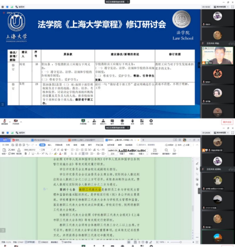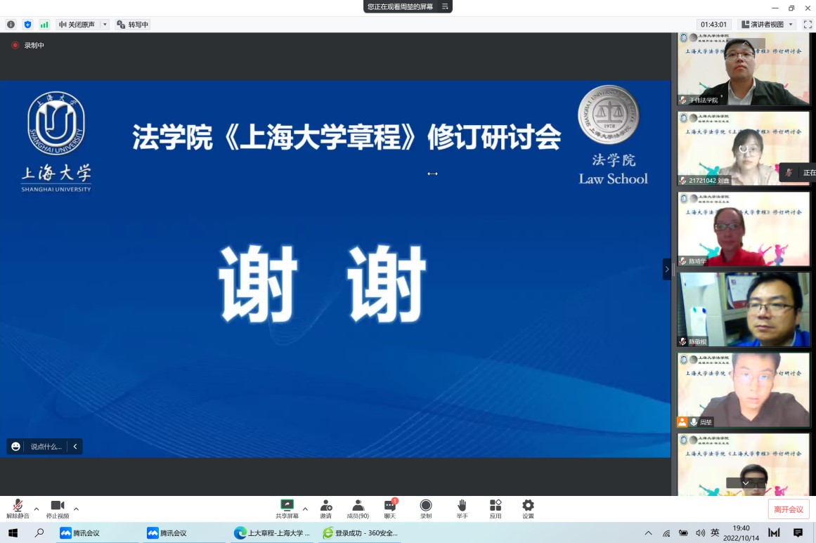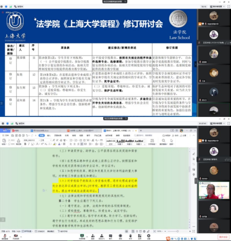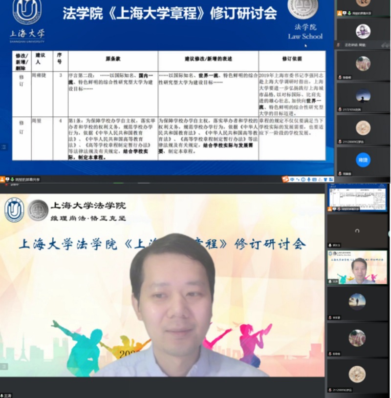 10月14日晚,法学院《诸侯快讯入口官网章程》修订研讨会在腾讯会议平台顺利举行。诸侯快讯入口官网章程修订工作领导小组办公室常务副主任、党政办副主任、法务办主任陈敬根,党政办副主任张晶晶,法务办朱瞳、潘美瑜,法学院党委副书记、副院长于伟,法学院副教授陈琦华、副教授赵清林、青年教师王涛、团委书记林建玲,以及法学院学生代表等近百人出席本次研讨会。研讨会由法学院研究生会主席、2021级研究生周堃同学主持。