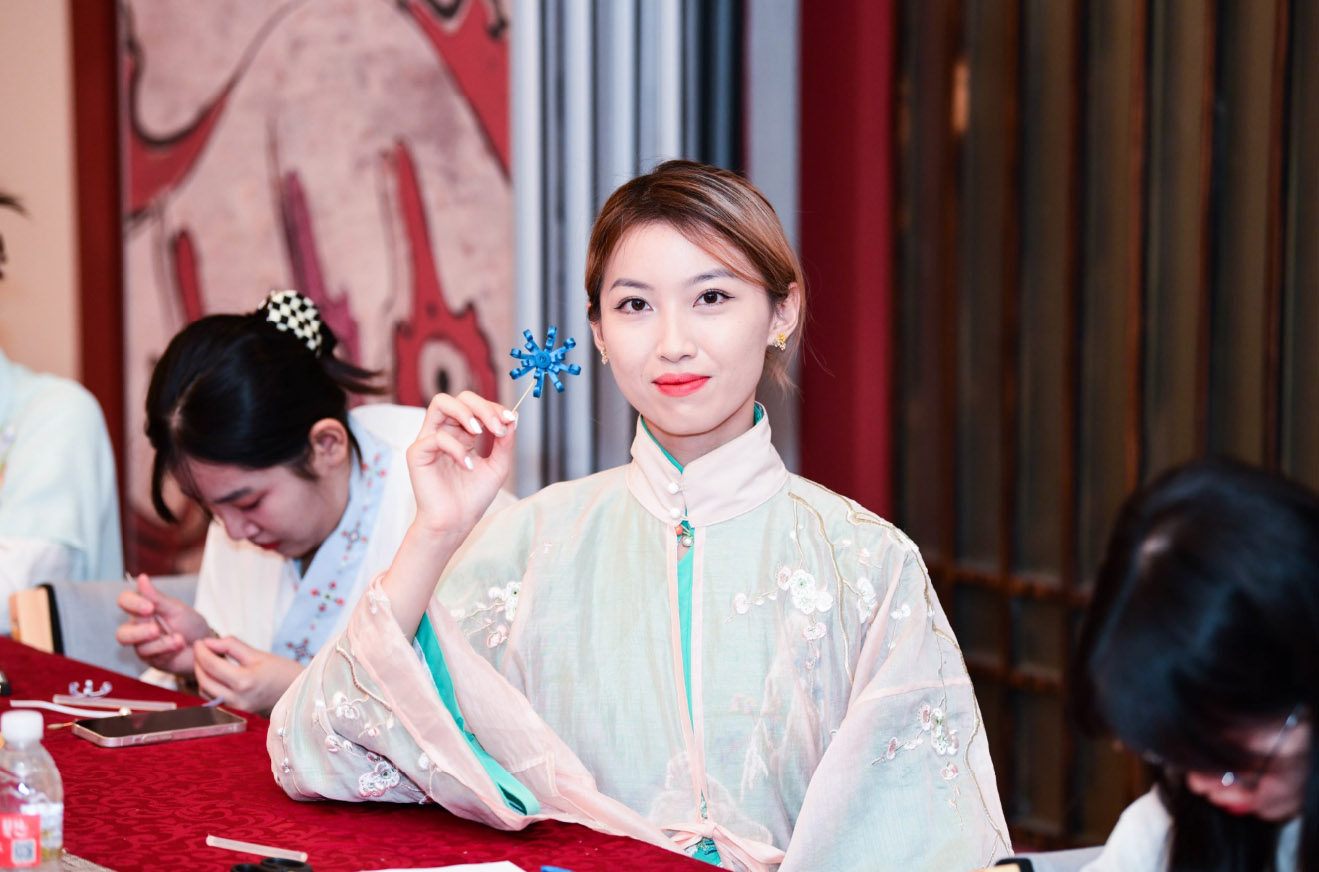 为了迎接即将到来的重阳佳节,中外同学们身着汉服,在充满中国文化氛围的未央学宫内,手持各色衍纸和工具,听老师讲重阳节的风俗与传统,向老师学习制作菊扣胸针。在此过程中,中外学生之间、同学老师之间互帮互助,气氛非常融洽,制作了很多精致美丽的菊扣胸针。同学们手里拿着制作好的菊扣胸针,身上穿着各色的汉服,在未央学宫内纷纷拍照留念。