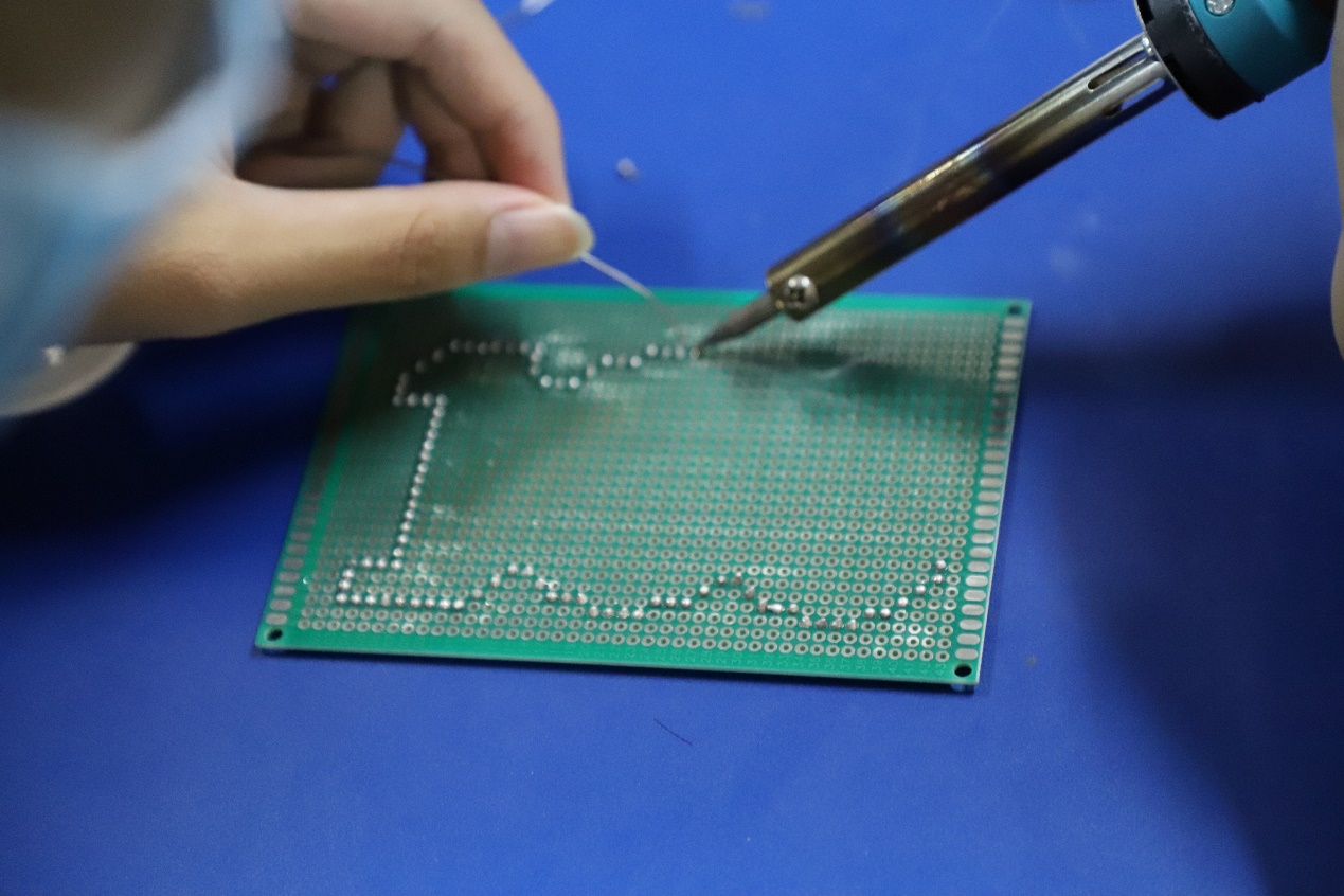 在同学们熟悉了焊接的基本操作后,胡权学长再次向同学们介绍了此次活动的主题:百年上大,由我“焊”卫,并向同学们征集焊接作品,以“百年上大”为主题的电路板。前三名优秀的小组将会获得由人工智能社团提供的奖品,同学们都跃跃欲试,开始设计与焊接自己的图案。