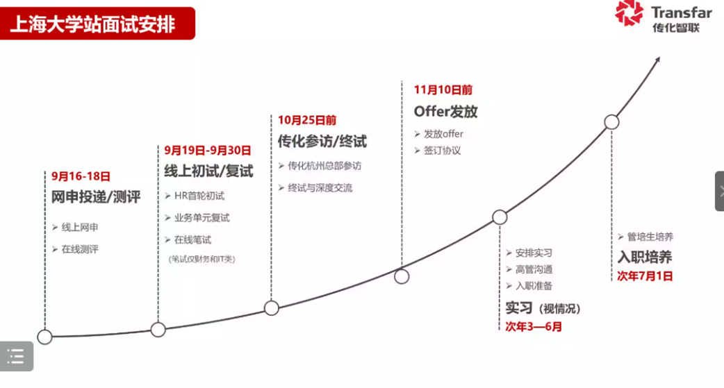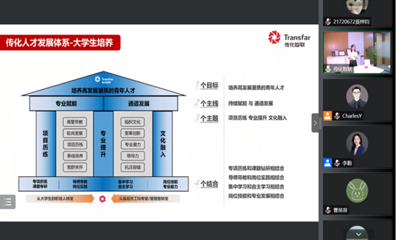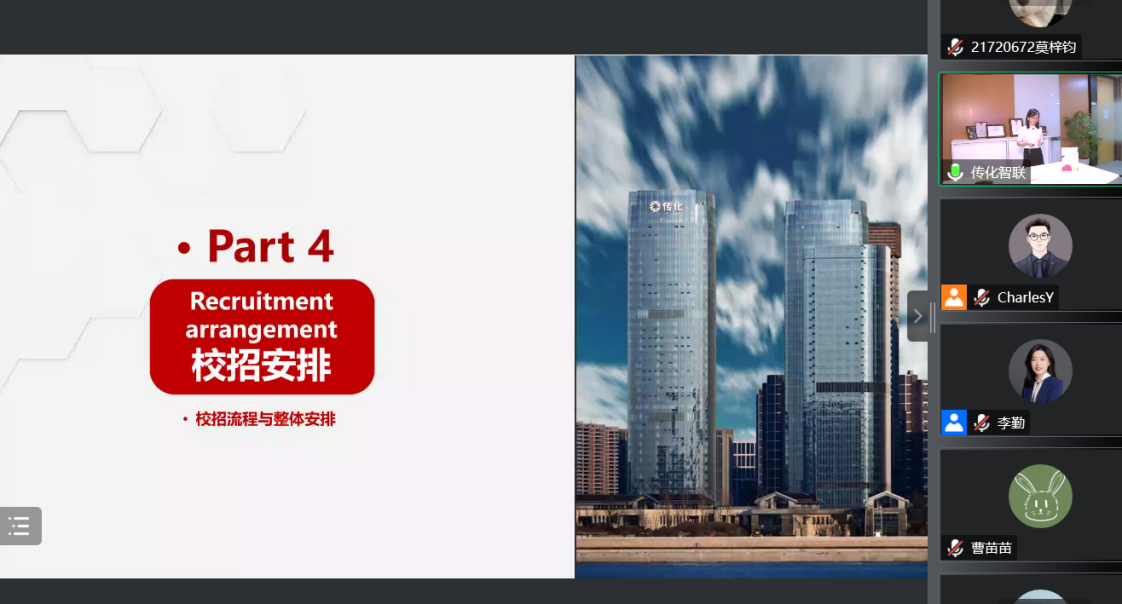 沈总重点介绍了今天来进行招聘的传化集团下属上市公司传化智联的人才发展规划,她从组织与人才发展理念、职业发展路径、传化人才发展体系-培养项目、大学生培养体系和薪酬福利等方面进行了详细的介绍。