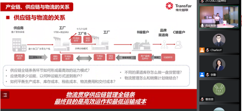 紧接着,传化智联的沈总展开分享。首先,她利用“某公司的10亿库存危机”的例子生动引入,分析了产业链、供应链与物流的关系。