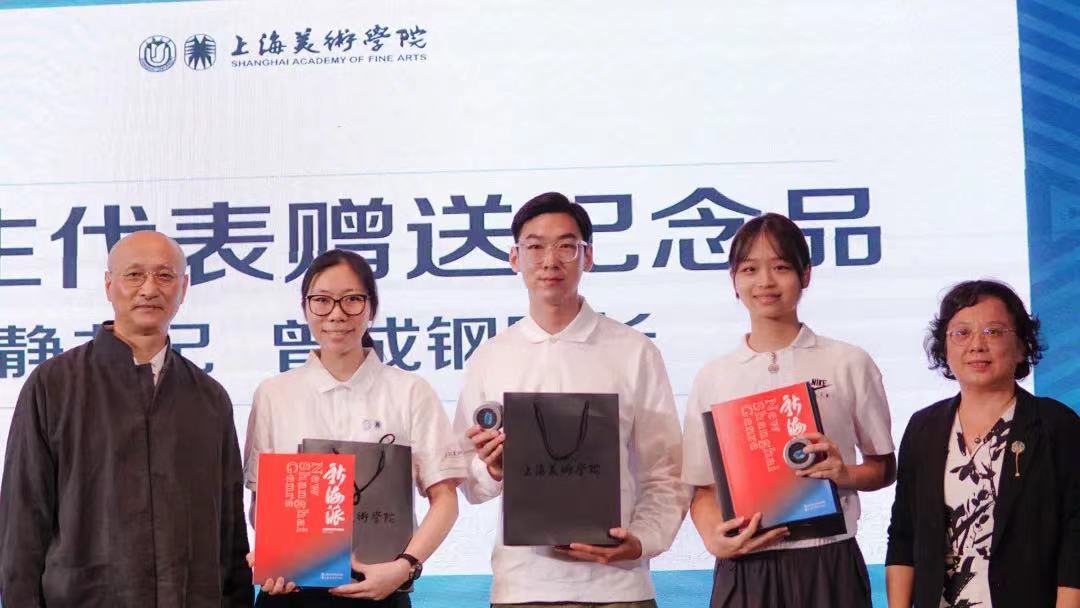 上海美术学院党委书记陈静、院长曾成钢为为新生代表赠送纪念品,勉励他们在新的人生起点努力奋进,顽强拼搏。