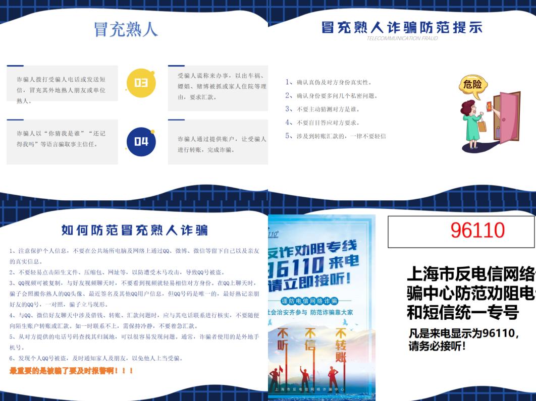 陆警官提到,新生初进校园,最容易受到的就是“冒充熟人类”诈骗,在每年的9-10月高频发生,诈骗人通过盗取微信、qq,利用当事人好友的同情心进行钱财诈骗。陆警官一一向同学们详细讲解了常见冒充熟人诈骗犯罪手法、冒充熟人诈骗防范提示,并通过案例视频警示同学们不能掉以轻心,要留存好反诈劝阻专线电话与校保卫处电话,遇到可疑一定要及时报警。