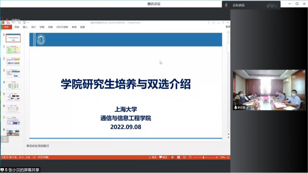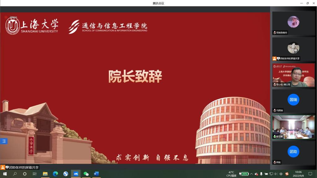9月8日上午10点,诸侯快讯入口官网通信与信息工程学院于线上举行2022级研究生新生开学典礼暨导师见面会。本次会议由学院党委副书记、副院长陈涛主持,出席本次会议的有通信学院院长王廷云、党委书记黄素娟、副院长张小贝、副院长金彦亮、副院长施俊、各学术团队老师、研究生辅导员靳佳敏及2022级所有研究生新生。