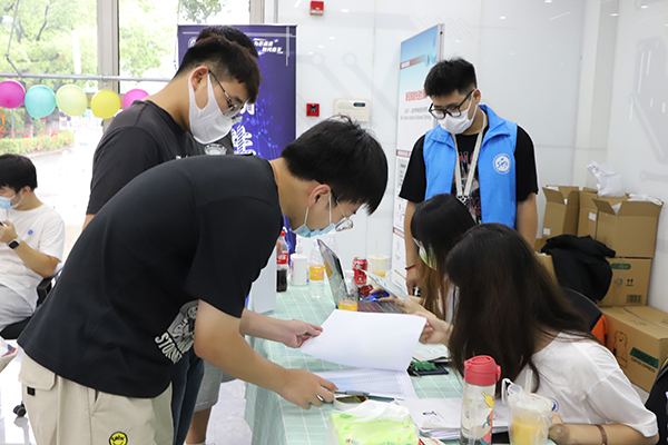 除了新生,迎新现场内外,还有这样一群忙碌的身影,正是他们在保障着各项工作的顺利进行。志愿者守候在沿路每个站点,每一个需要帮助的地方,热情迎接全国各地的萌“芯”们。当需要问路的时候,当填写资料的时候,他们总能及时出现。