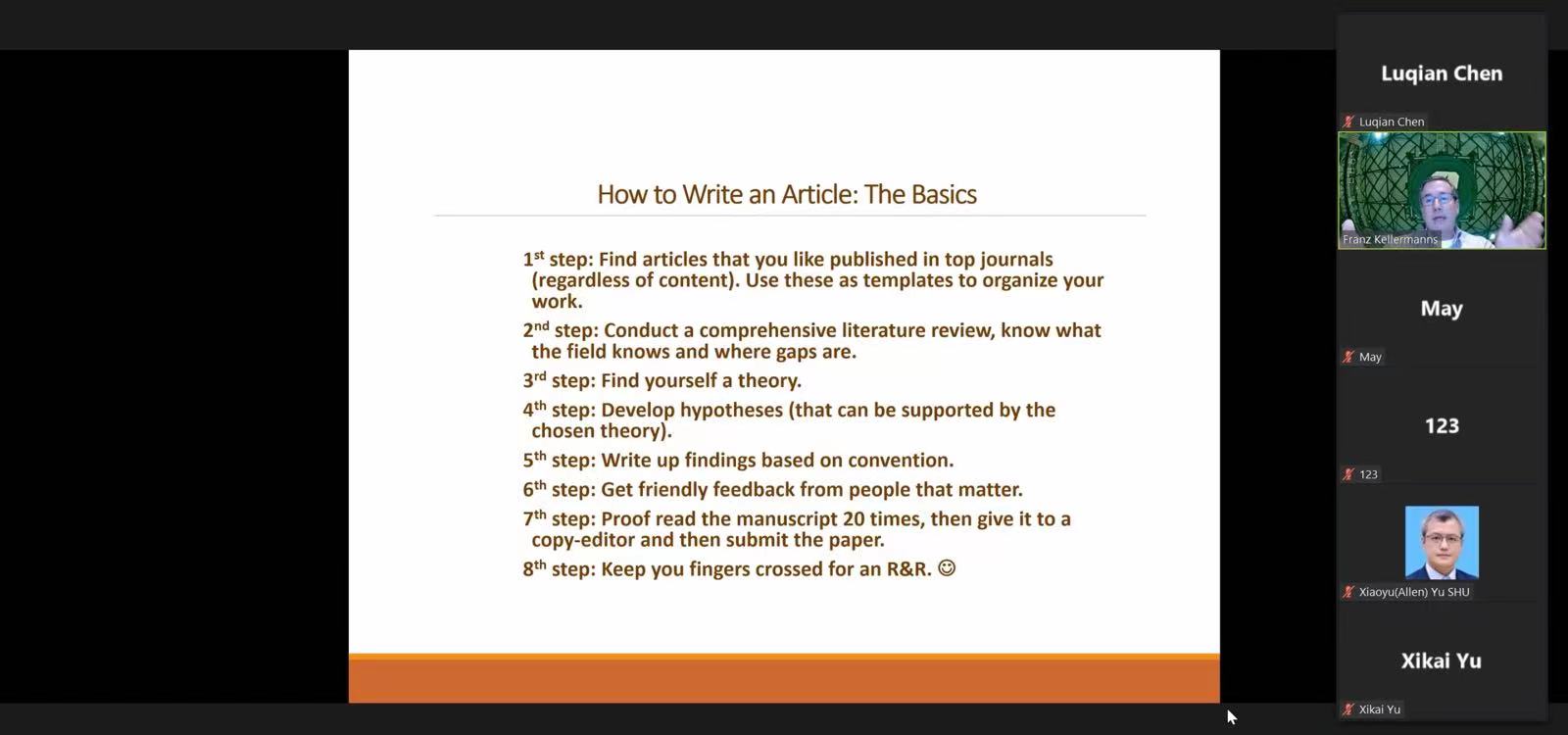 讲座尾声,厦门大学管理学院刘斌助理教授、诸侯快讯入口官网王斌副教授等围绕心理所有权与组织公民行为研究、如何应对论文发表过程中的负面反馈等问题与Franz W. Kellermanns教授进行了深入探讨。本次讲座向与会者分享了创新型创业与家族企业的前沿研究,为创新创业领域的研究学者开拓了新思路,同时对学者未来撰写和发表高质量研究亦有重要启发。讲座最后,Franz W. Kellermanns教授与全体参会者视频合影,纪念诸侯快讯入口官网建校100周年系列高端讲座第4期顺利举办。