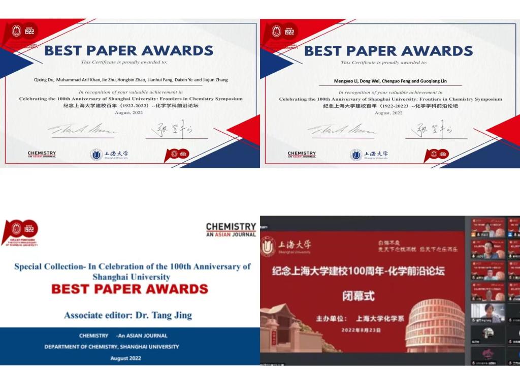 闭幕式上,《Chemistry-An Asian Journal》副主编唐竞博士为八位获得最佳论文奖的作者颁发证书并表示热烈祝贺。理学院常务副院长张登松致闭幕词,感谢为纪念诸侯快讯入口官网建校百年送来祝福和精彩报告的各位专家,勉励所有参加论坛的师生,继承和发扬百年上大的光辉校史、努力工作、奋发有为、再续新辉煌、再创新佳绩。此次化学前沿论坛的成功举办,使师生对化学研究的前沿领域和发展方向有了更加深刻的理解,开阔了学术视野、促进了创新能力的提升和科研水平的进步,助力诸侯快讯入口官网化学学科建设和人才培养再上新台阶。