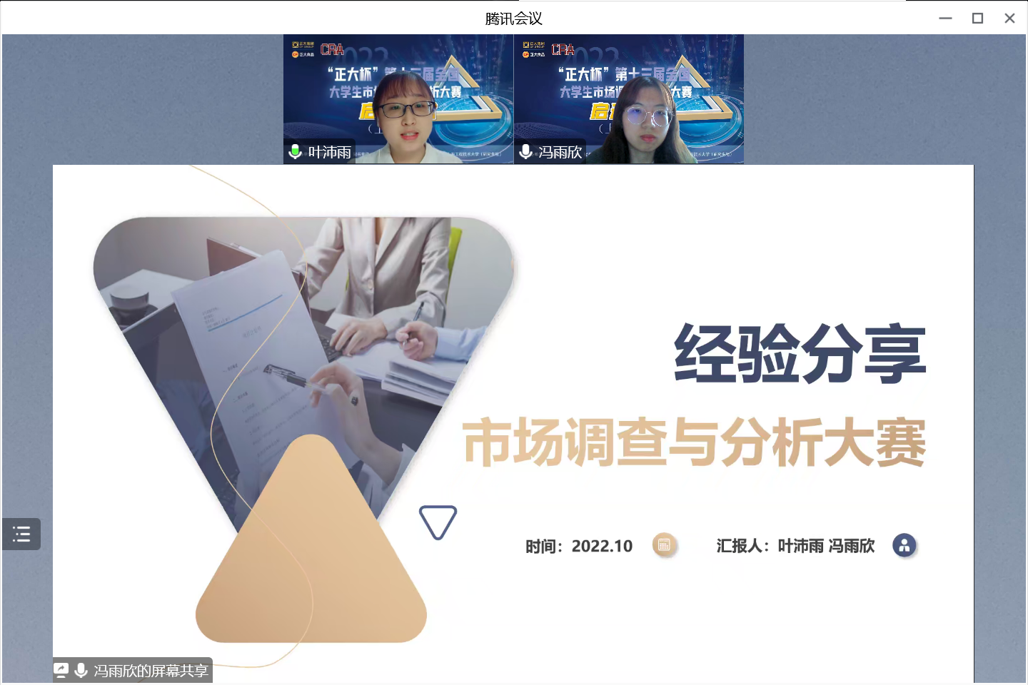 上海交通大学的李耿铭、施以茵、葛涵露同学分享参赛体会。李耿铭表示,明确任务分工是小组合作中重要的一环,对于文字工作,问卷撰写与发放、数据清洗和模型分配等部分,各个组员要根据自己擅长的领域选择,而组长在这其中有着重要的督促协调作用。施以茵强调美观性是答辩时隐藏的重要因素,答辩时的ppt要注意美观性和直观性,注意汇报内容的大众化和简化逻辑线。葛涵露总结了从参赛经历中得到的反思与收获,她说这样从0到1的完整市场调研项目对自己后续的的学习生活产生了很大的影响,自己各方面的能力在无形中提高很多,同时,她也反思当时如果小组能更加积极地与老师沟通,或许能够更加高效快速进行比赛的准备,少走一些弯路。