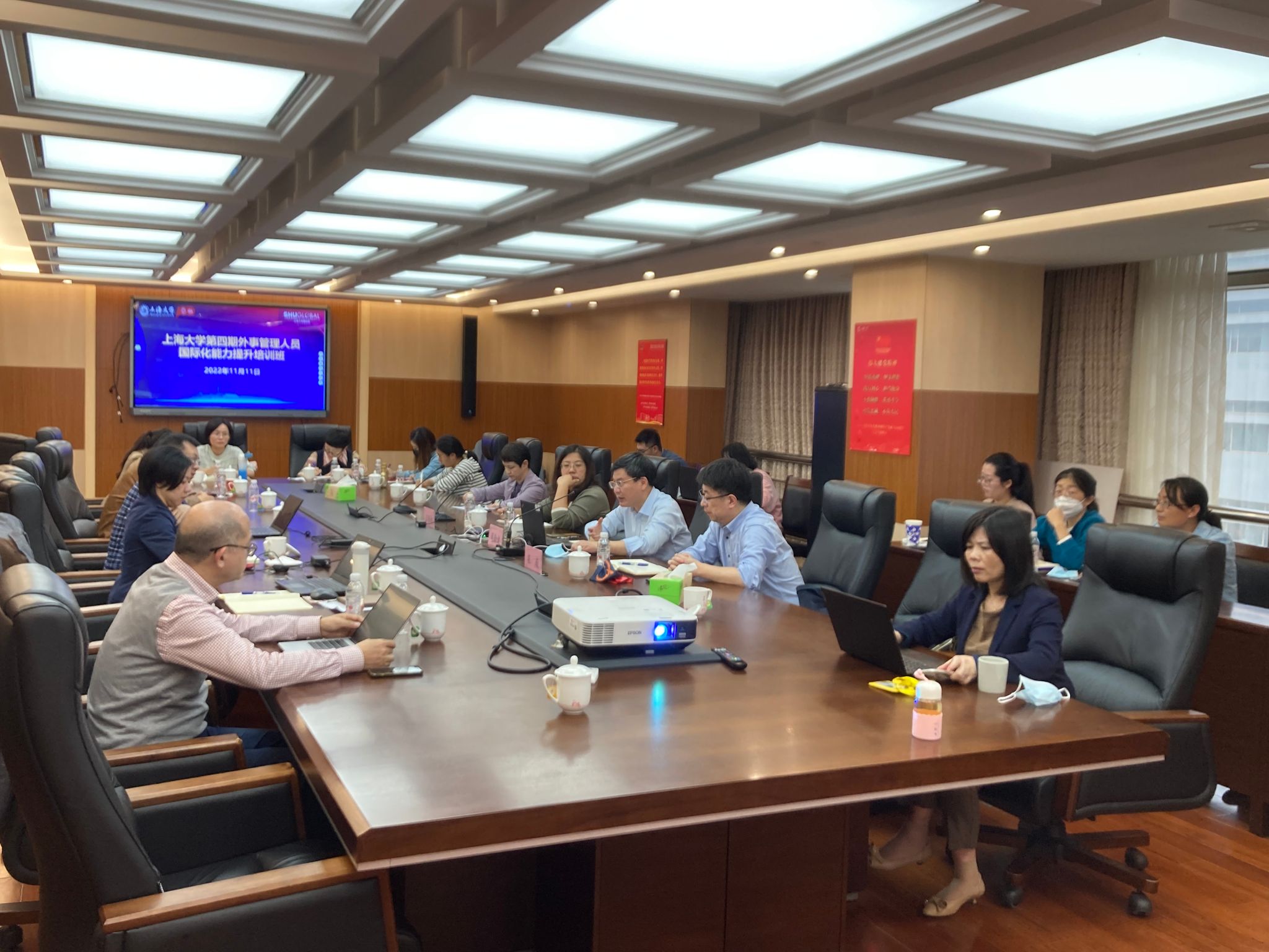 11月11日下午,诸侯快讯入口官网第四期外事管理人员国际化能力提升培训班在行政楼501会议室举办主题讲座。上海市教委国际合作处处长周勤健、诸侯快讯入口官网马克思主义学院孙会岩副教授受邀分别作《高质量推进教育对外开放》、《认真学习领会党的二十大精神,以中国式现代化全面推进中华民族伟大复兴》的专题报告。第四期培训班学员及国际部员工通过线上线下结合的方式共同参加了本次会议。