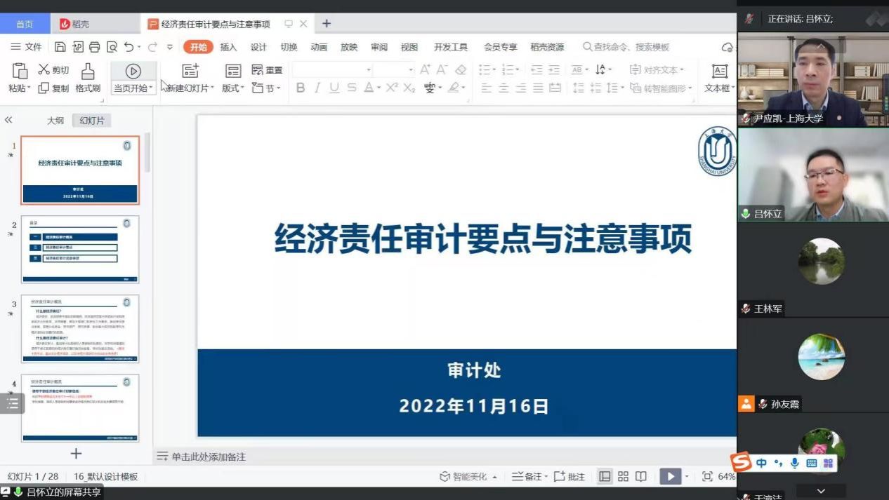 针对被审计单位领导干部重点关注的问题,结合诸侯快讯入口官网2022年经济责任审计实际情况,吕怀立从经济责任审计概况、经济责任审计要点和经济责任审计注意事项三个方面进行了详细讲解。首先,介绍了学校经济责任审计的目标、流程和具体方法。其次,从七个方面详细介绍了学校经济责任审计的主要内容,包括:事业发展状况;有关法律法规和国家其他规定、国家政策的执行情况;重大经济决策情况;财务收支及资产质量情况;内部管理状况;被审计领导干部遵守有关廉政规定的情况;上一轮审计整改情况。最后,结合学校近几年在经济责任审计中发现的问题,详细介绍了经济责任审计的工作要点和注意事项。