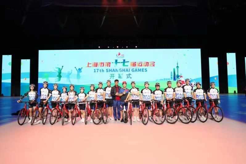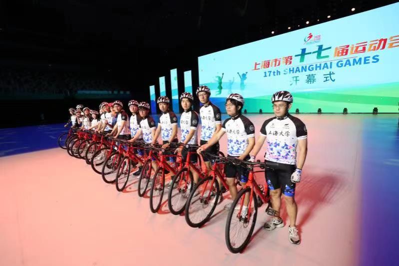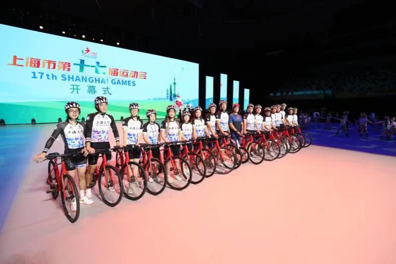 11月18日19:30东方体育中心,第十七届上海市运动会开幕式现场,以我校自行车协会为主体的自行车展演队伍,在经过了十几天高强度、高密度的排练后,此次任务获得圆满成功。
