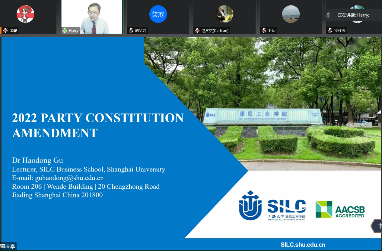 11月21日晚,悉尼工商学院工管系教师党支部举行学习领会二十大精神专题党课。党支部书记、学院国际部主任顾浩东围绕二十大审议修订的《中国共产党章程》,结合学院国际化商学院的特点,组织支部党员同志专题党课学习,副院长胡笑寒参加支部党课学习并讲话。