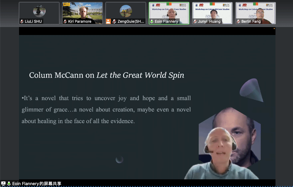 科克大学白贵理教授主持主旨发言。首先,弗兰纳里教授以爱尔兰裔当代作家科伦·麦凯恩(Colum McCann)的两部小说作品《舞者》和《转吧,这伟大的世界》为例,分析了小说中身体与表演景观对于彰显作家“救赎美学”的重要作用和意义,他的文本细读与精到分析为麦凯恩研究提供了新思路。