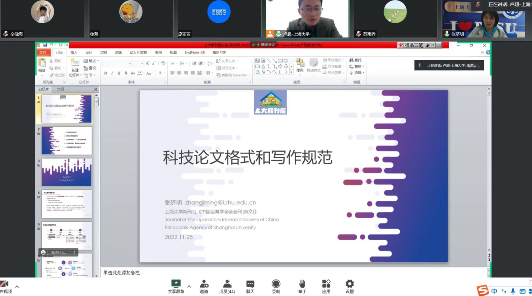 张济明老师首先从五个方面详细介绍了“科技论文格式和写作规范”,包括科技论文的概念、特征和类型,撰写科技论文的准备,论文投稿方向(国内外数据库收录期刊),论文的投稿、审稿和出版流程,以及论文的基本格式和规范。同时,针对论文写作发表中可能出现的问题进行了讲解分析,向与会师生推荐《数学科学与技术研究论文写作》和《SCI论文写作与投稿》两本书深入阅读。