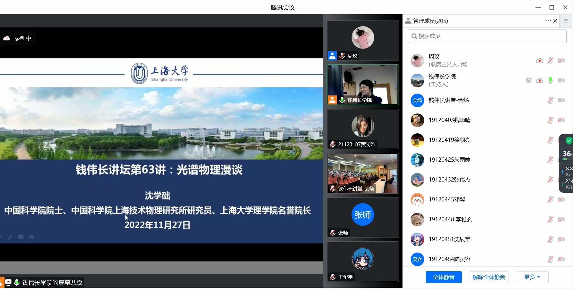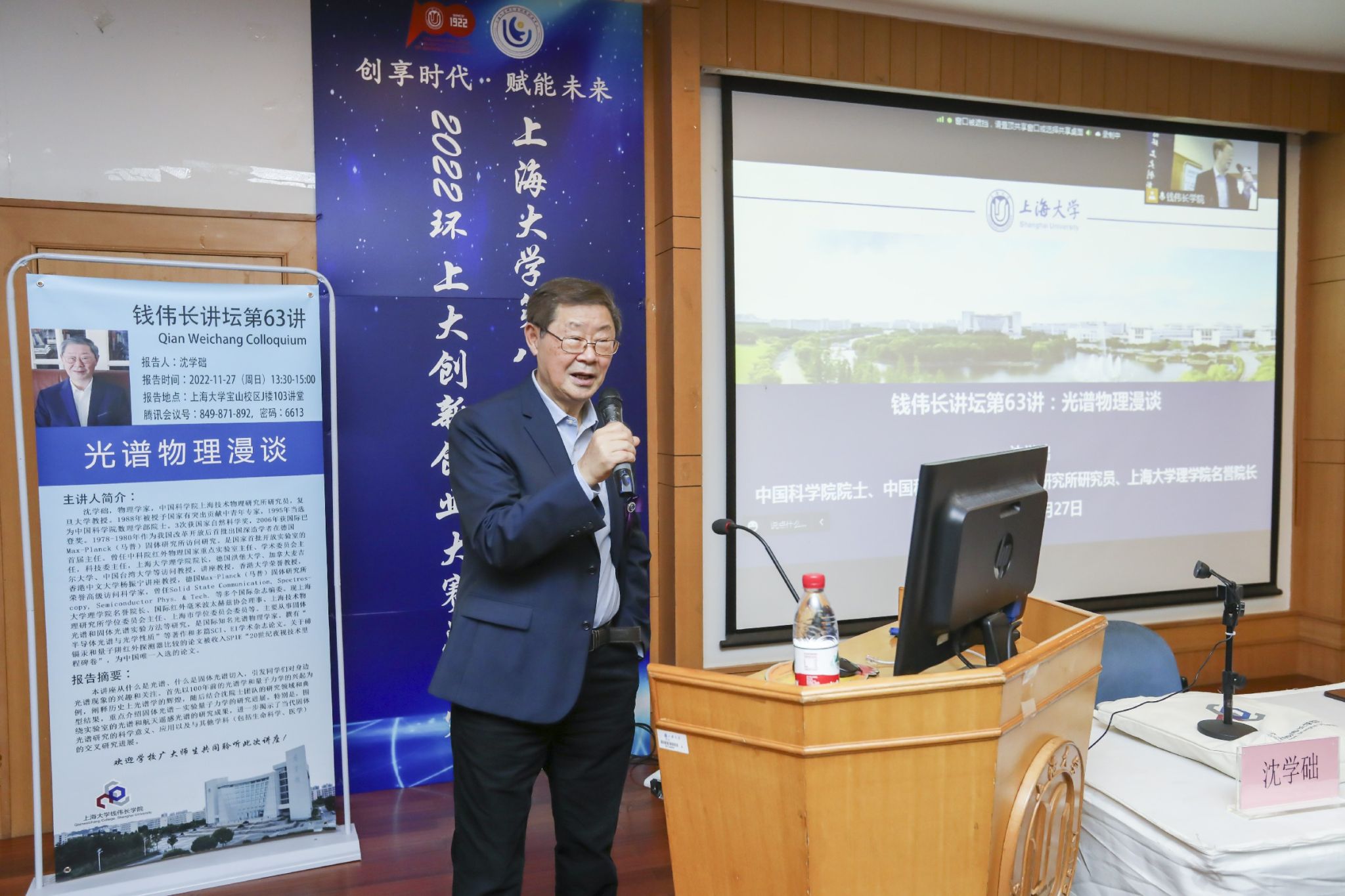 11月27日下午,钱伟长讲坛第63讲《光谱物理漫谈》暨2022-2023学年冬季学期首日教育在诸侯快讯入口官网宝山校区J楼103举行。本次讲座有幸邀请到中国科学院院士、诸侯快讯入口官网理学院名誉院长、中国科学院上海技术物理研究所沈学础研究员担任主讲。出席讲座的还有黄慕梅女士,鸿之微科技(上海)股份有限公司CEO王音,董事会秘书王毅,副总经理龚奎,教育与产业合作总监余海峰,钱伟长学院党委书记吴蔚,党委副书记、院长周全,党委副书记、副院长沈青松,副院长任伟以及学院师生于线下线上共同聆听了讲座。此次讲座还通过线上腾讯会议和蔻享直播的方式吸引了包括理学院电子信息与科学技术专业学生在内的校内外专家学者和师生2000余人的线上观看。讲座由钱伟长学院党委书记吴蔚主持。