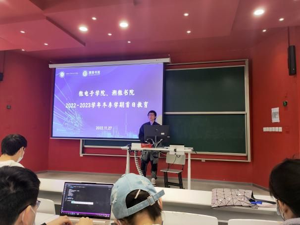 11月27日上午,微电子学院、溯微书院2022-2023学年本科生冬季学期首日教育在嘉定校区第二教学楼112室及宝山校区DJ203同时举行。微电子学院党委副书记、副院长、溯微书院执行院长袁铭老师,团委副书记、本科生辅导员宗琪老师、本科生辅导员朱泽昀老师与全体本科生共同参与此次首日教育活动。