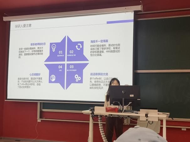 随后,四位19级保研同学为学弟学妹做保研经历分享,几位同学均表示保研中就是打一场至关重要的“信息战”与“海投战”。无论是走保研夏令营还是九推,保研人一定要通过各种渠道悉知推免细则、保研信息、各院校的具体面试细则和重要时间点,争取取得最好的保研offer。