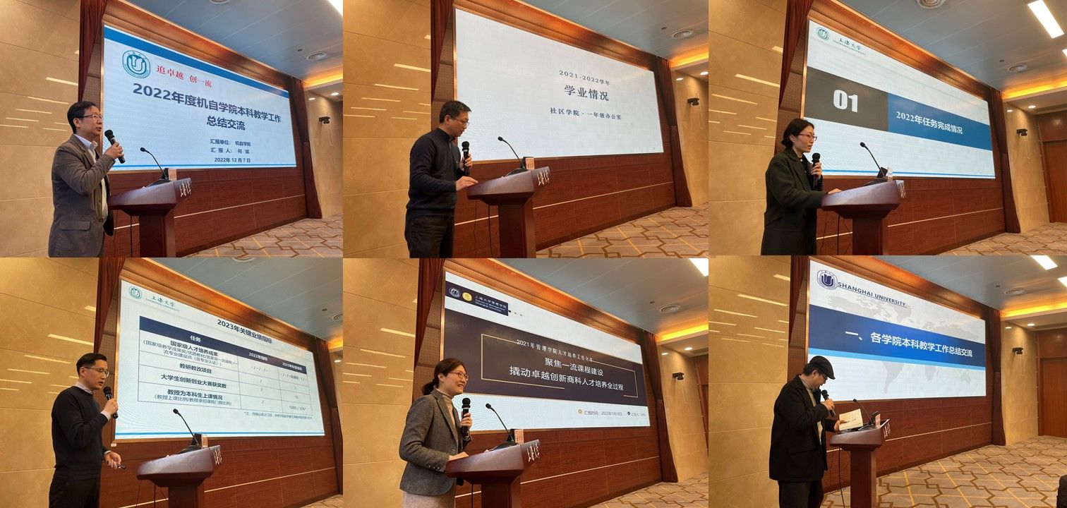 各学院分管教学工作的副院长、学院代表从2022年任务完成情况、关键举措和成效、2023年目标和任务三个方面,分别汇报了课程思政建设、日常教学管理、一流专业建设情况、学科竞赛获奖情况、课程和教学团队建设情况、教学成果项目等方面年度工作,并对2023年本科教育教学工作作了展望。