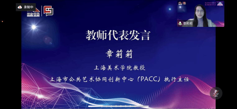 随后,上海美术学院教授、上海市公共艺术协同创新中心(PACC)执行主任章莉莉作为教师代表进行发言。她在发言中提到了不同学科、专业之间进行交流沟通,加强学习思考,加强团队协作、互补优势的重要性。同时建议同学们,第一要认真学习党的二十大精神,从国家最需要发展的领域中找到方向,提出问题,并尝试跨学科解决问题;第二要对参赛要有信心、有毅力、有韧力,希望同学们都能够积极参与,努力奋斗,取得佳绩。