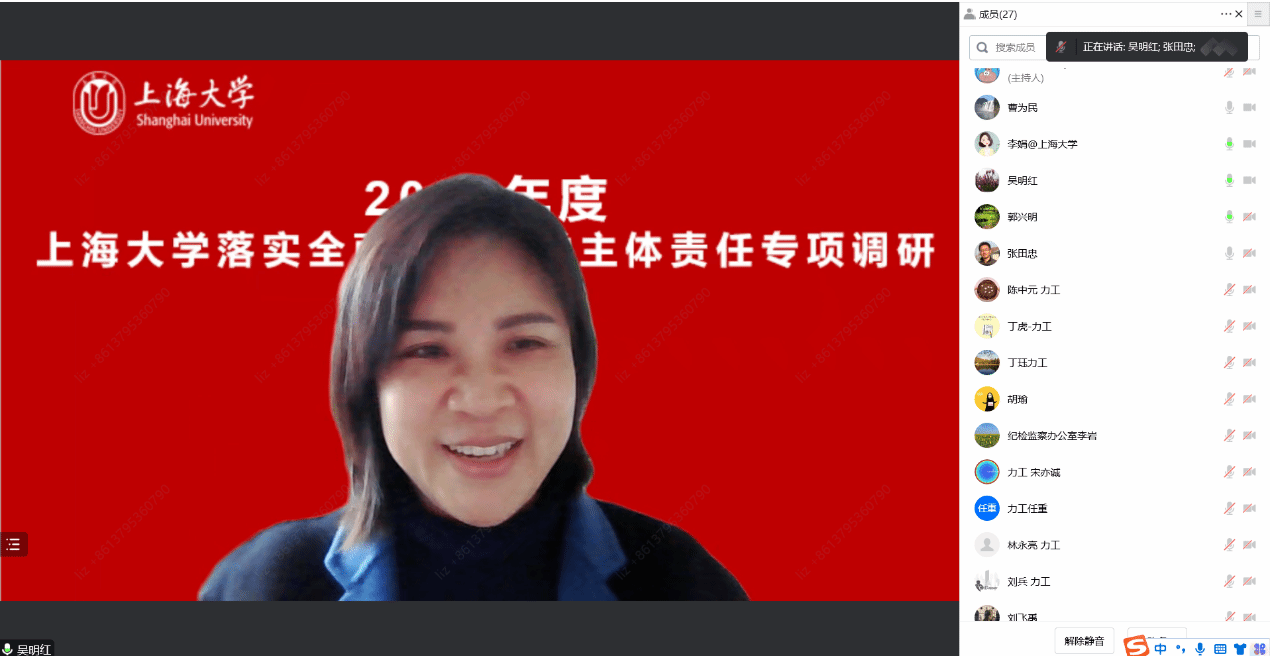 1月15日,校党委常委、副校长吴明红院士,党委常委、统战部部长曹为民,宣传部副部长汤琳夏、党政办副主任李娟、组织处党委组织员尚彩伶、巡察办副主任胡瑜、纪检监察办李岩一行调研、指导力学与工程科学学院党委落实全面从严治党主体责任工作情况,学院领导班子成员、骨干教师代表、教工党支部书记代表出席了本次线上会议。