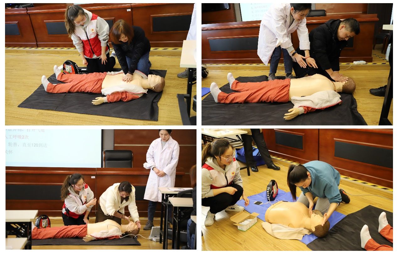 实操环节,在张老师和邓医生的指导下大家依次上前借助教学模拟人等器材实际演练了心肺复苏、气道异物梗阻、AED体外除颤仪使用等救护技能,基本掌握初级救护的技能要领,气氛生动热烈。