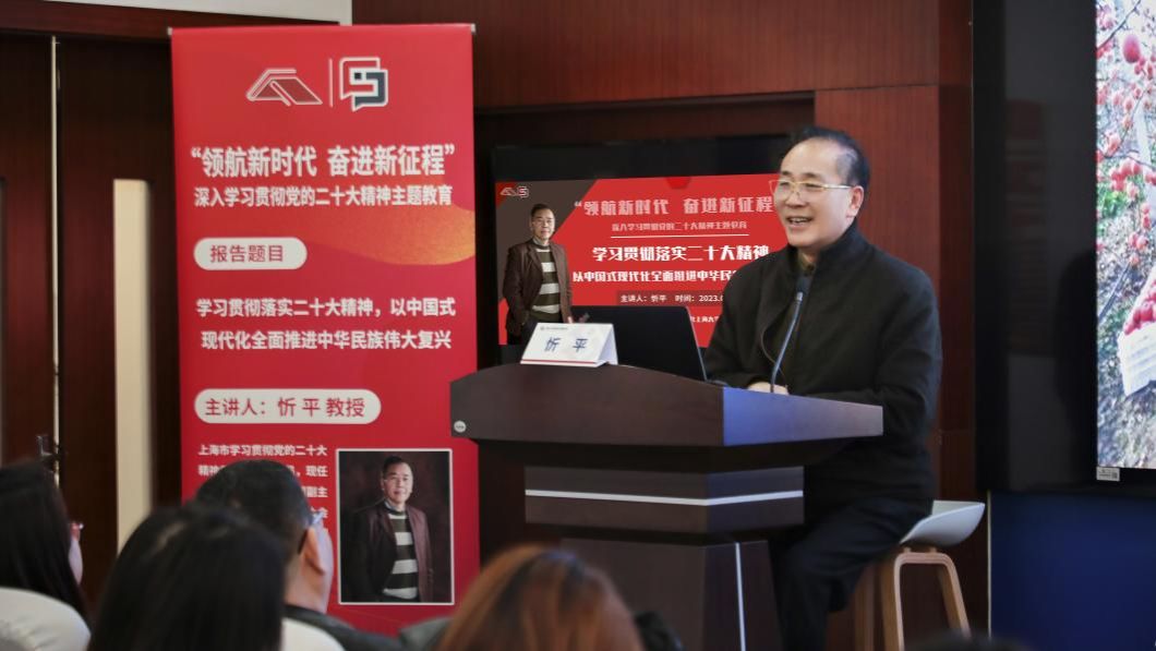 讲座伊始,忻平教授紧紧围绕新起点、新思想、新成就、新征程、新时代和新发展六个方面,分别对党的二十大的主要成果和重要意义、马克思主义中国化时代化、习近平新时代中国特色社会主义思想、中国过去五年和新时代十年取得历史性成就和历史性变革、以中国式现代化全面推进中华民族伟大复兴等内容展开了详细论述。