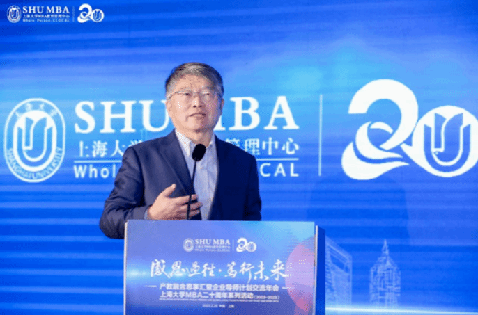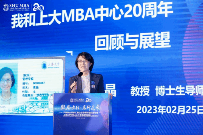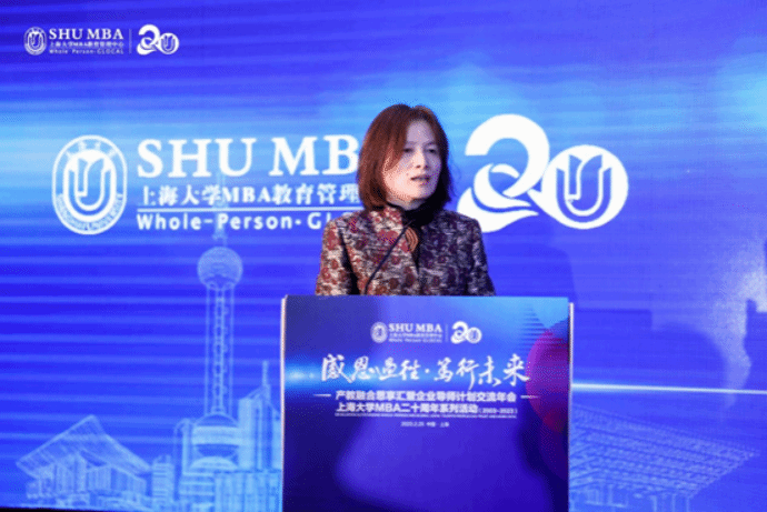 贾晶从一张首届学生的开学典礼照片开始提到自己与上大MBA结缘20年,见证了上大MBA的发展,她希望上大MBA导师计划有个深层次的延伸,讨论商学院底层教育的逻辑、认知和思维,最后,她表达了对上大MBA的衷心祝福,期待上大MBA在校领导的领导下,在年轻一代的带领下,能够越办越好。