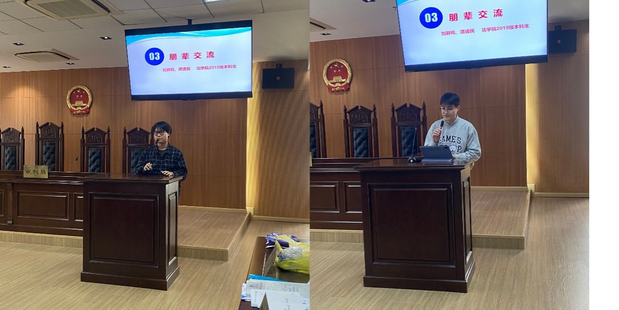 朋辈交流环节中,2019级法学专业本科生刘羿鸣、2019级知识产权专业本科生谭清民同学站在学生的角度,分享自己的学习经历。