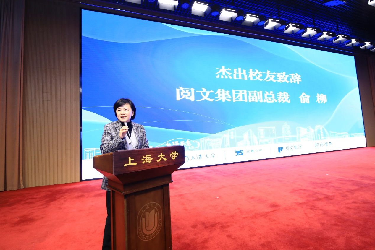 俞柳副总裁在讲话中表示,很开心回到母校参与活动启动,推动校企共建进入新阶段。希望阅文平台高品质的文学作品能助力母校的思政工作建设,在校园培养阅读风尚,也期待进一步骤焦产学研共建,在培养适应社会发展的高质量复合型人才上展开进一步探讨。