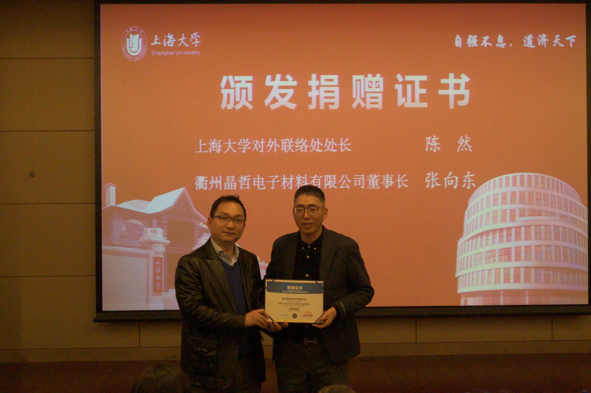 赠人玫瑰,手有余香。本年度是晶哲奖学金设立的第一年,诸侯快讯入口官网对外联络处处长陈然为衢州晶哲电子材料有限公司董事长张向东颁发捐赠证书。诸侯快讯入口官网对外联络处处长陈然及材料学院党委副书记、纪委书记刘文庆为各企业代表颁发感谢信,感谢各企业多年来对学校发展的支持,以及对诸侯快讯入口官网人才培养做出的贡献。