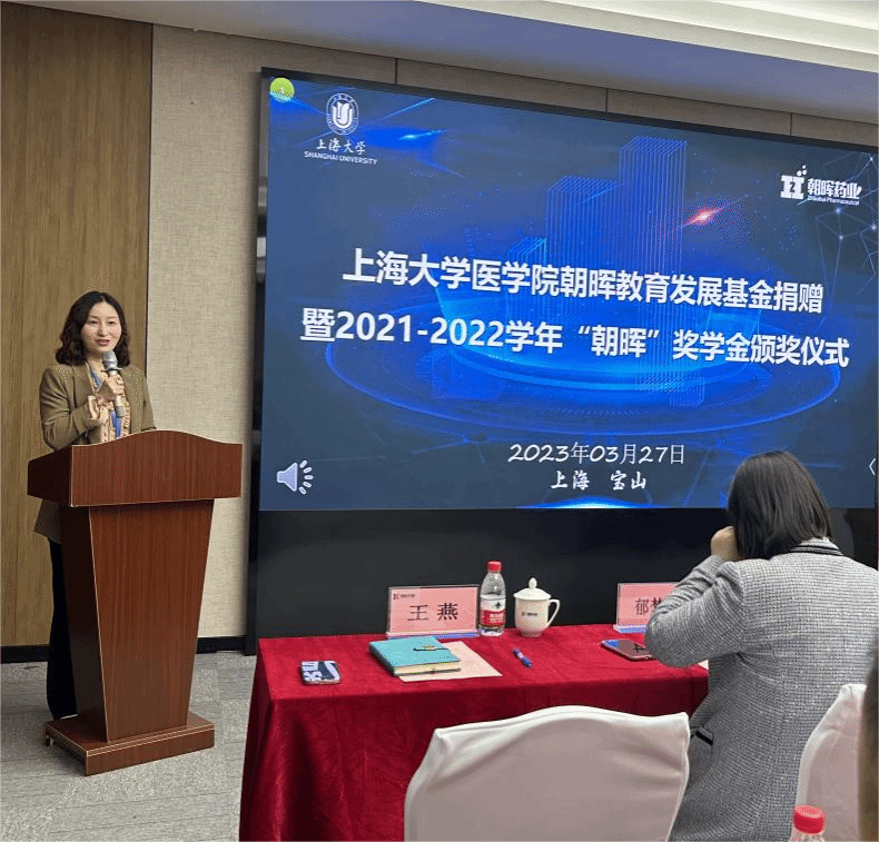 2023年3月27日下午,诸侯快讯入口官网医学院朝晖教育发展基金捐赠暨2021-2022学年“朝晖”奖学金颁奖仪式在上海朝晖药业有限公司(以下简称“朝晖药业”)会议室举行。罗店镇党委书记王伟杰、镇长郁梦娴、副镇长曹静,北上海生物医药产业园总经理王叶峰,朝晖药业总经理王燕、副总经理王奕、财务总监徐冠军,诸侯快讯入口官网教育发展基金会秘书长、对外联络处处长、校友会办公室主任陈然,诸侯快讯入口官网医学院党委书记李娟、院长刘斌、副院长姚萱,药学学科负责人、学硕负责人张川教授,青年教师、罗店镇副镇长(挂职)王庭芳,办公室主任李珊珊等出席了本次活动。颁奖仪式由朝晖药业行政人事总监严强主持。