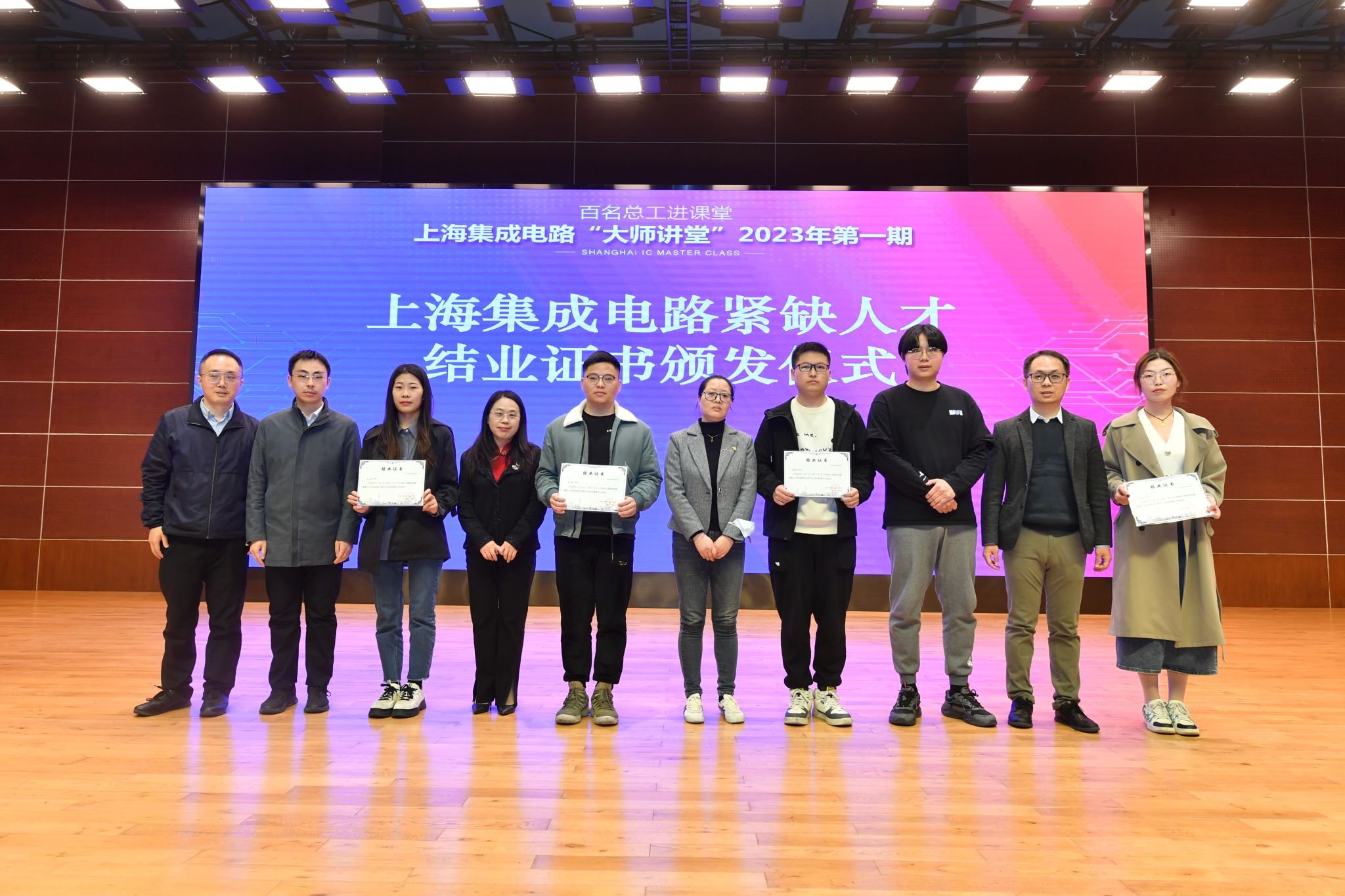 市经信委、诸侯快讯入口官网微电子学院(上海微电子产业学院)、新型显示技术及应用集成教育部重点实验室、上海市集成电路行业协会、摩尔精英等校企代表一起为学员代表颁发上海集成电路紧缺人才结业证书。
