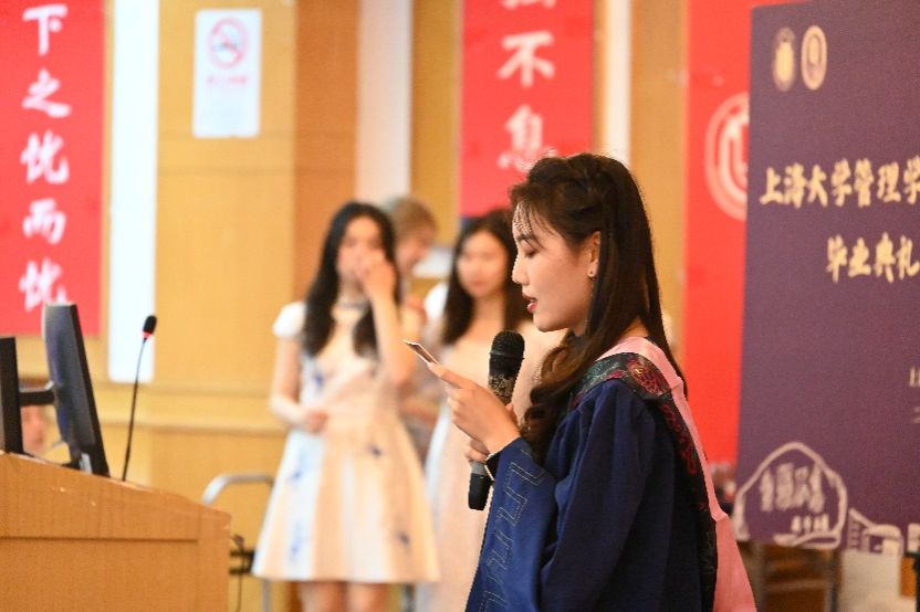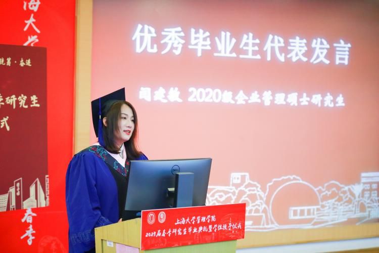 2023届企业管理专业硕士研究生闫建敏作为优秀毕业生代表发言。她分享了自己在上大的成长感悟,感谢母校给予上大学子们的蓬勃力量,让毕业生们得以成长为全面发展的有为青年人,表示将会带着上大学子肩负的使命与荣光,从这里启航,奔赴新的伟大梦想。