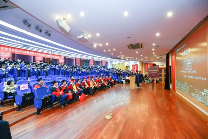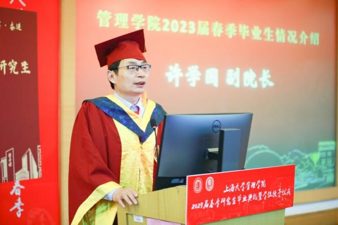 典礼上,副院长许学国介绍了管理学院2023届春季毕业生的整体情况。本届管院毕业生共发表核心期刊70余篇,并在研究生创新实践系列大赛、挑战杯、互联网+和大学生英语竞赛等各类科创竞赛中取得了国家级奖项56项,省部级奖项18项。他们在学术科研、创新竞赛、实践活动上取得了丰硕的成果,为自己的未来积累了丰富的经验。