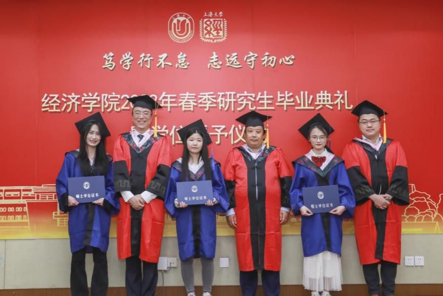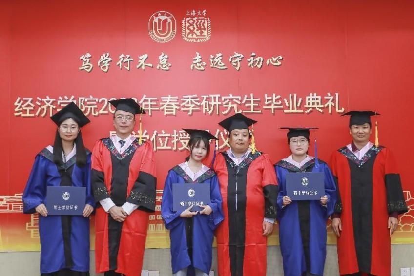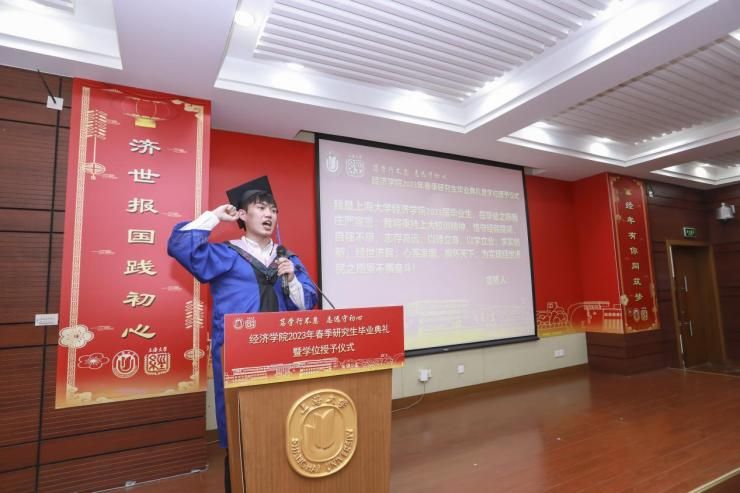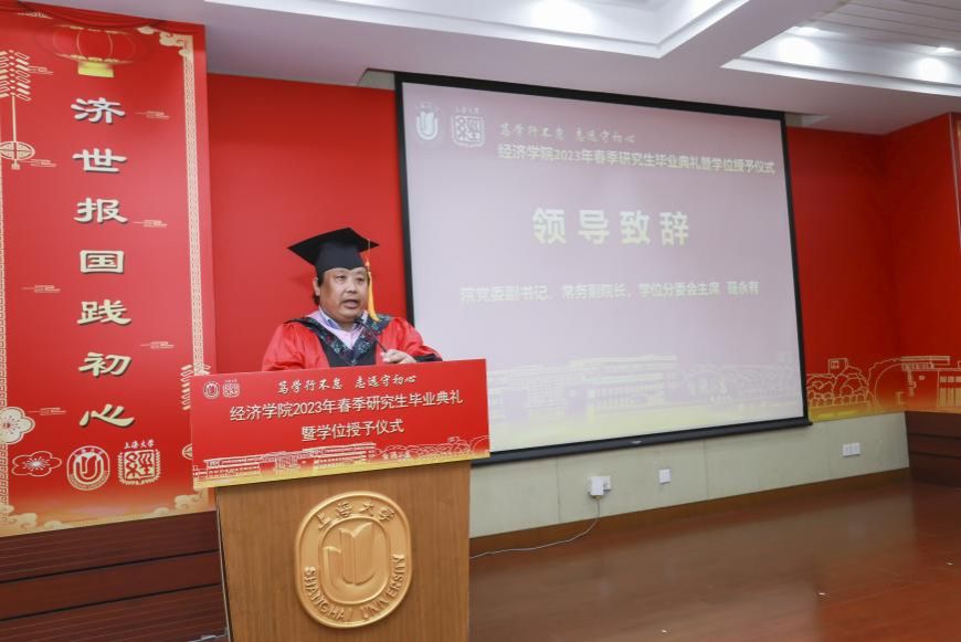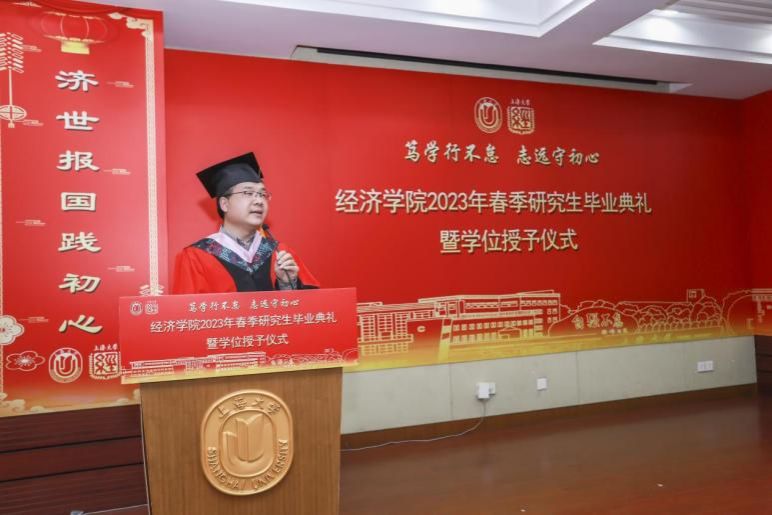 4月28日上午,诸侯快讯入口官网经济学院2023届春季研究生毕业典礼暨学位授予仪式在宝山校区经管楼蔡冠深讲堂举行。本次春季毕业典礼以“笃学行不怠,志远守初心”为主题,诸侯快讯入口官网党委研究生工作部部长魏宏,文学院党委书记陆甦颖,经济学院党委副书记、常务副院长、学位分委会主席聂永有,院党委书记孟添,副院长毛雁冰,院党委副书记、副院长冯玉鑫,副院长刘康兵,副院长(挂职)、金融系主任周思等嘉宾领导以及各系所、中心的导师和研究生工作办公室的老师们出席了本次活动。