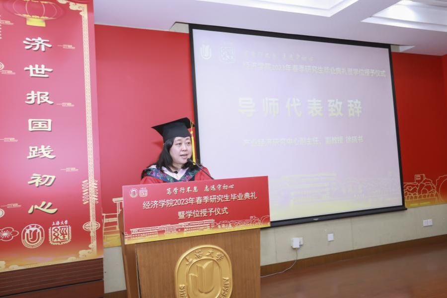 短短的毕业纪念视频《泮望》让在场老师同学再次重温了上大的青春时光。母校是家一样的存在,这些带着时光印记的点点滴滴将会持续散发温暖的光亮,照亮毕业生们前行的路途。这部珍贵的毕业纪念视频,不仅是毕业生们留给母校的一份珍贵礼物,也是老师们与同学们对毕业生们最深情的祝福。虽然毕业生们即将离开校园,但他们留下的美好回忆和深刻感动,将伴随着大家一起前行,永远不会被遗忘。同时,研究生前行路上离不开导师的谆谆教导与悉心栽培。导师代表徐晓书为同学们送上毕业寄语,她希望所有的同学能够确立并强化自己的核心竞争力,在生活中保持乐观的态度,与时俱进持续学习,老师临别的寄语饱含对毕业生们的殷殷嘱托与灼灼期望。