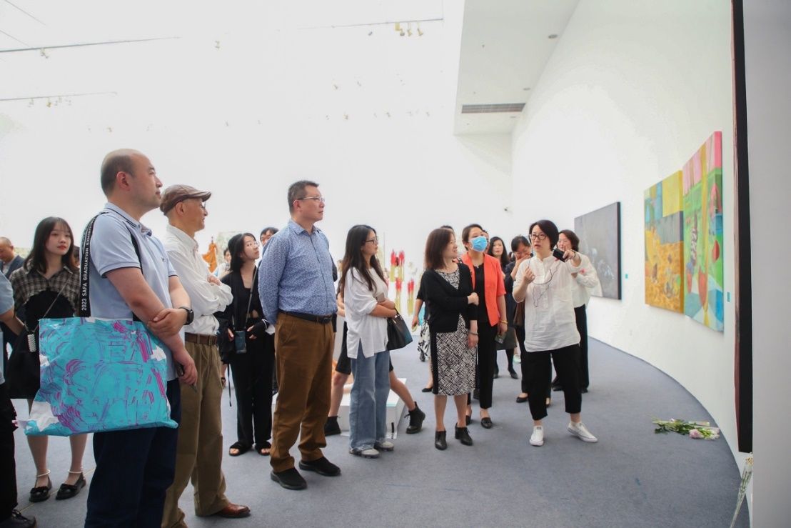 开幕式上还举行了主视觉视频发布仪式,各位嘉宾共同为2023上海美术学院毕业季暨毕业展揭幕。随后,策展人程雪松副院长介绍本科毕业展总体情况、策展人翟庆喜副院长介绍研究生毕业展总体情况。齐然、唐天衣、肖敏、刘晓军等老师以及部分参展同学为各位嘉宾做现场导览。