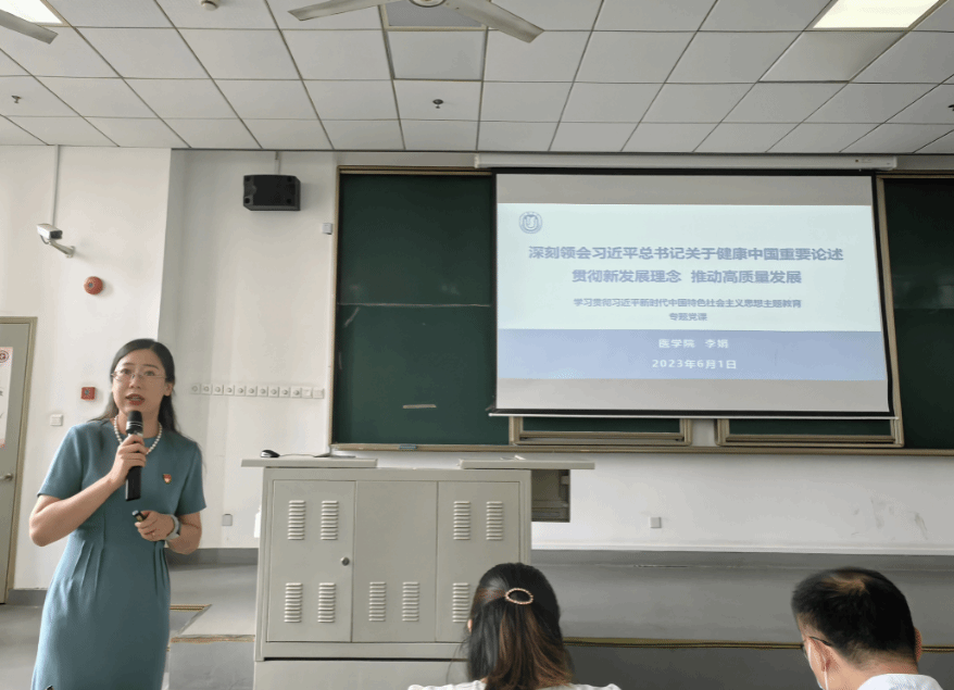 为深入开展学习贯彻习近平新时代中国特色社会主义思想主题教育,6月1日上午,医学院党委书记李娟为医学院师生党员讲授了题为“深刻领会习近平总书记关于健康中国重要论述,贯彻新发展理念,推动高质量发展”的专题党课。校党委联络组联络员洒强、医学院全体师生党员参会学习。