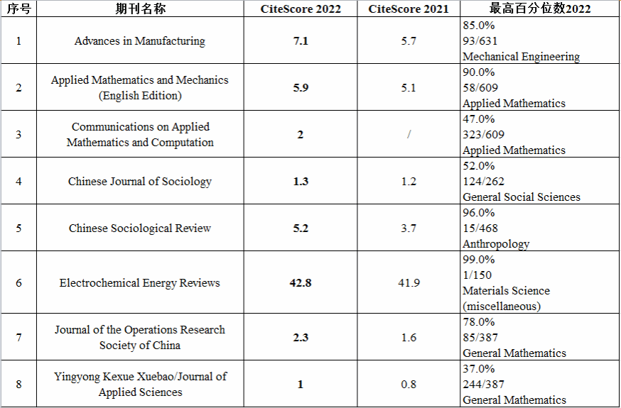 《电化学能源评论(英文)》(Electrochemical Energy Reviews)2022年CiteScore42.8,在全球Materials Science (miscellaneous)、Chemical Engineering (miscellaneous)、Electrochemistry三个学科中继续位列第1位。《应用数学和力学(英文版)》(Applied Mathematics and Mechanics(English Edition))2022年CiteScore达到5.9,较2021年5.1提升了15.7%,在全球Applied Mathematics学科609种期刊中排名第58位,较2021年提升了12位。《先进制造进展》(Advances in Manufacturing)2022年的CiteScore为7.1,较2021年5.7提升了24.6%,所属四个学科均进入前20%。Chinese Sociological Review2022年CiteScore为5.2,较2021年的3.7提高40.5%,在1415种期刊中学科排名处于前10%。《应用数学与计算数学学报(英文)》(Communications on Applied Mathematics and Computation)自2022年被Scopus收录后,今年收获了第一个引用分,发展态势喜人。