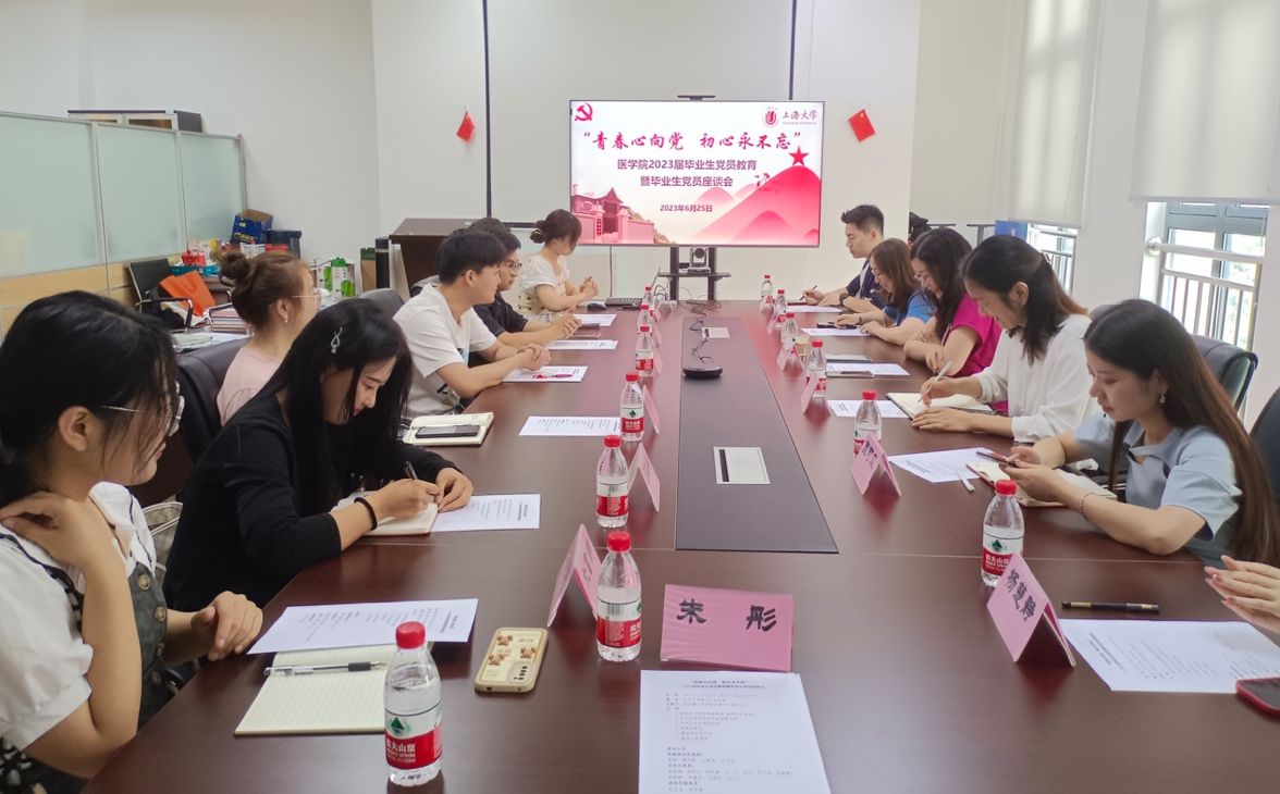 为深入学习贯彻习近平新时代中国特色社会主义思想,加强对毕业生党员的思想引领,提升毕业生党员的党性修养,6月25日上午,医学院开展主题为“青春心向党,初心永不忘”的2023届毕业生党员教育暨毕业生党员座谈会。学院党委书记李娟,党委副书记、副院长盛晓娜,党委组织员庄薪荣,研究生辅导员、研究生党建中心主任匡可风及2023届毕业生党员出席会议,会议由学院研究生党建中心副主任陈苏蒙主持。