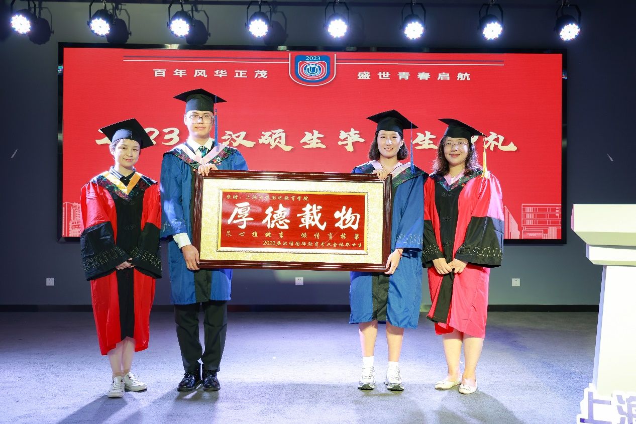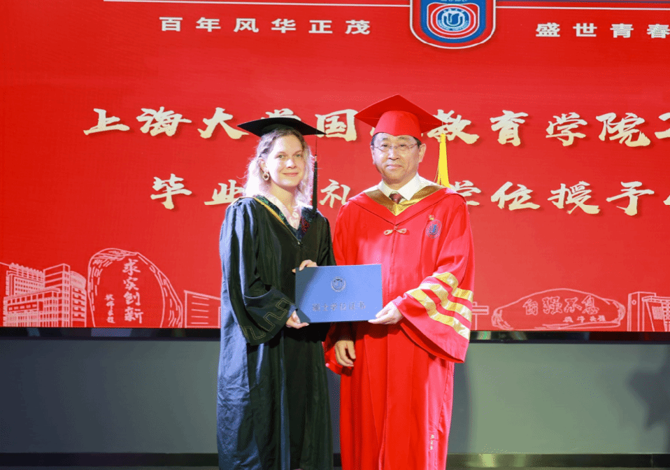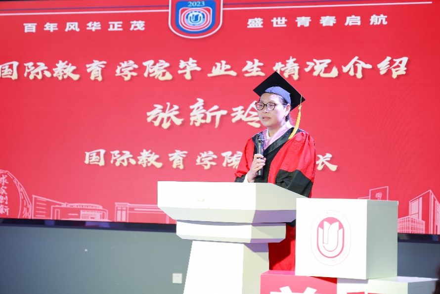在雄壮的国歌声中,毕业典礼拉开了序幕。国际教育学院副院长张新玲,介绍了今年毕业生的整体情况,共有21位国际本科生获得学士学位,27位中外研究生获得硕士学位。他们中有的将继续留在上大深造,有的即将踏上新的工作岗位。希望他们再接再厉,在未来的人生路上取得更辉煌的成绩。