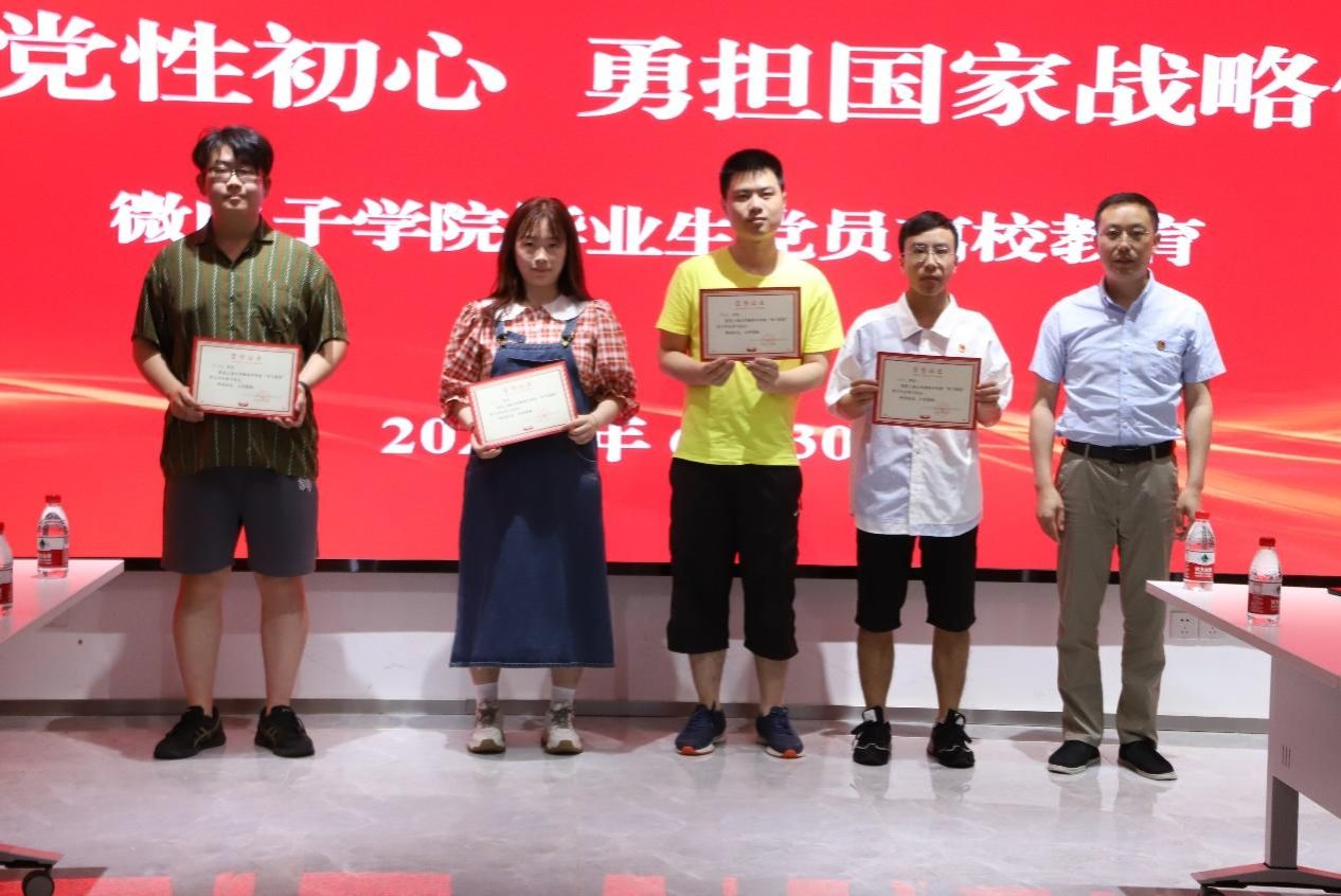 微电子学院党委书记郭纯生在毕业生党员教育中充分肯定了全体毕业生党员在校期间取得的优异成绩和树立的榜样作用,希望广大毕业生党员深入学习贯彻习近平新时代中国特色社会主义思想,牢牢把握主题教育“学思想、强党性、重实践、建新功”的总要求。一是要坚定理想信念。毕业生党员要始终牢记党员身份,筑牢信仰之基、补足精神之钙,把稳思想之舵,永远爱党为党敬党,坚定听党话、跟党走;二是勇于承担使命。毕业生党员要胸怀“国之大者”,勇担国家的战略使命,未来在集成电路行业继续发光发热,为国家卡脖子技术攻关贡献青春力量。三是要脚踏实地做人。毕业生党员要尽快适应角色的转换,做到一心为党,踏实干事,扎实苦干,默默奉献,在干事创业的实践锻炼中经受磨炼,干成一番事业。