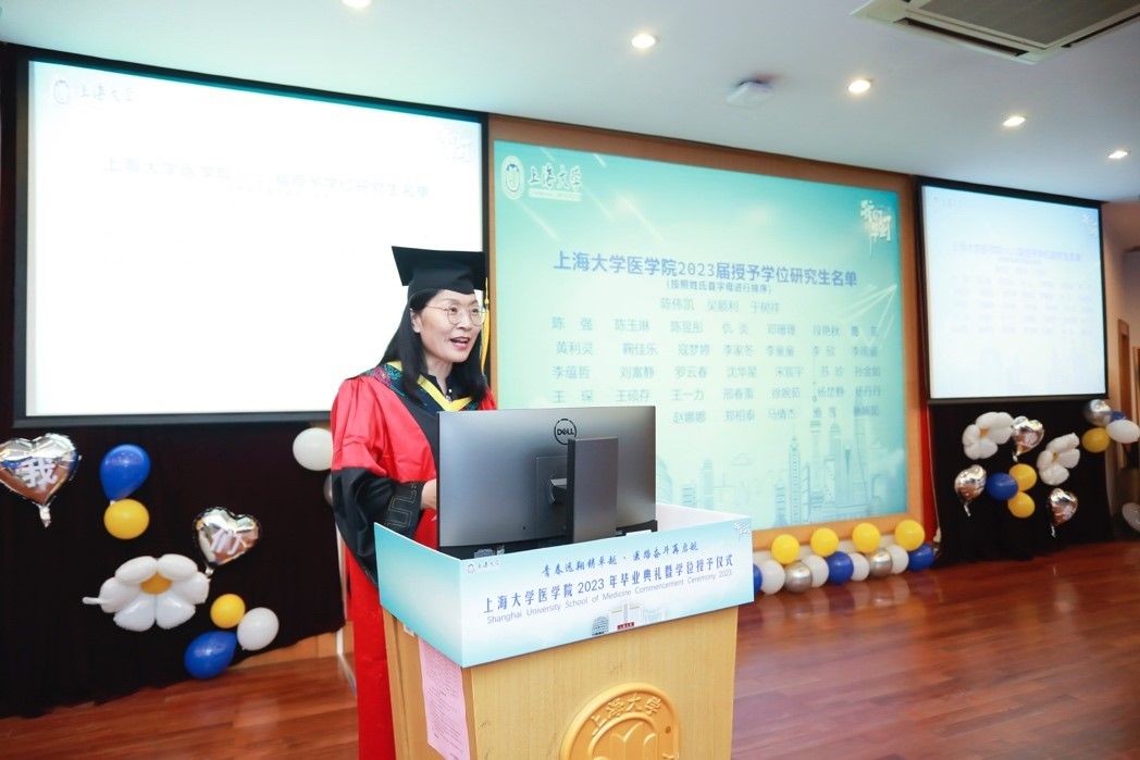 同窗情深,长风破浪。上海市优秀毕业生代表,生物化学与分子生物学专业硕士研究生王一力作为毕业生代表发言。他分享了在上大三年点滴的成长故事。他谈到2023届毕业生既是医学院“从无到有”、“从弱到强”逐步发展的见证者,也是“栽树人”,他将继续秉持校训精神,带着对学院和母校的爱,奋勇向前,用力奔跑,用顽强奋斗打开事业发展新天地。