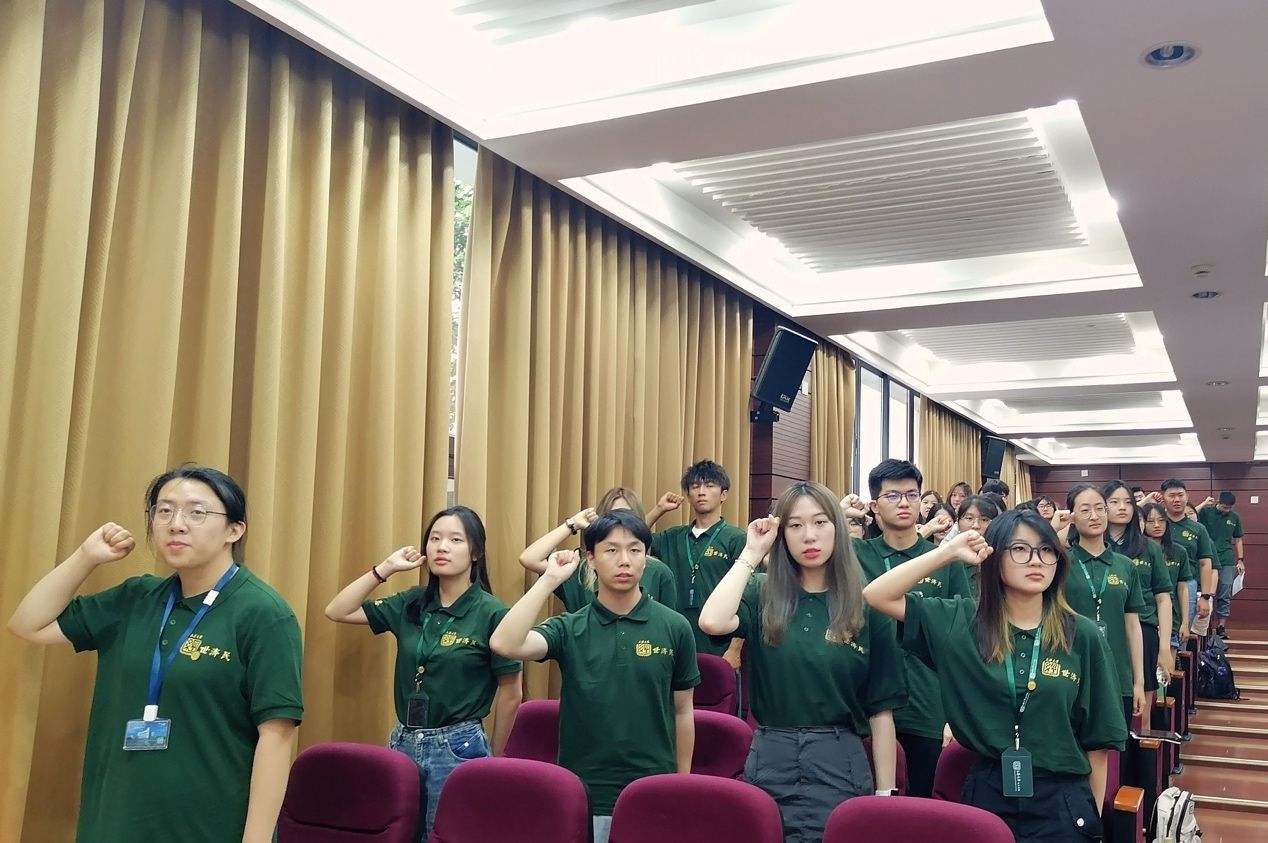 院旗的传递象征着经院精神的代代相传,孟添从导生代表手中接过院旗,授予22级新生代表并为22级新生代表们佩戴院徽。