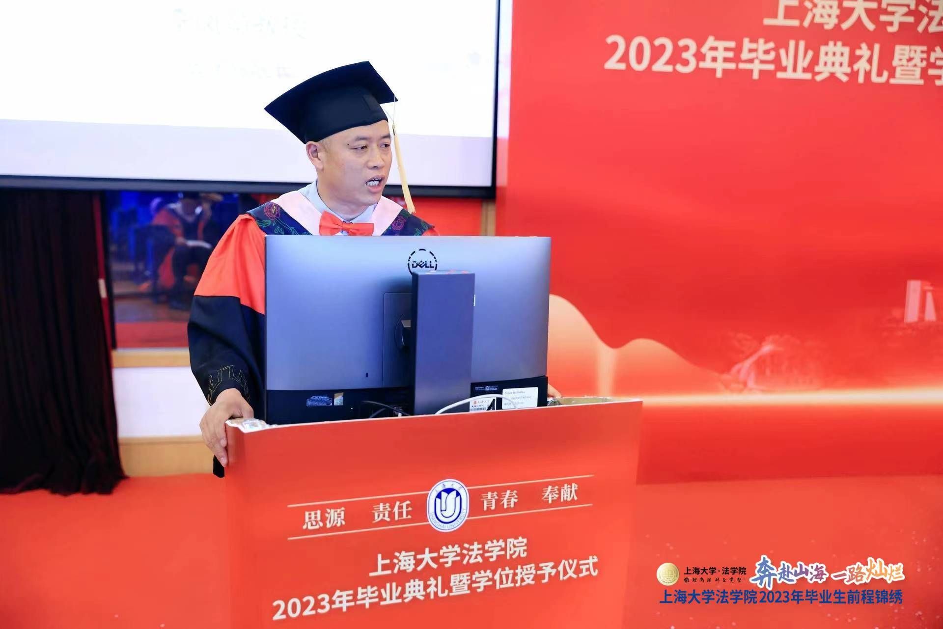 法学院副院长袁真富副教授宣读法学院2023年毕业生学位授予决定,法学院学术分委员会主任兰跃军教授、法学院副院长袁真富副教授分别为本、硕毕业生唱名。