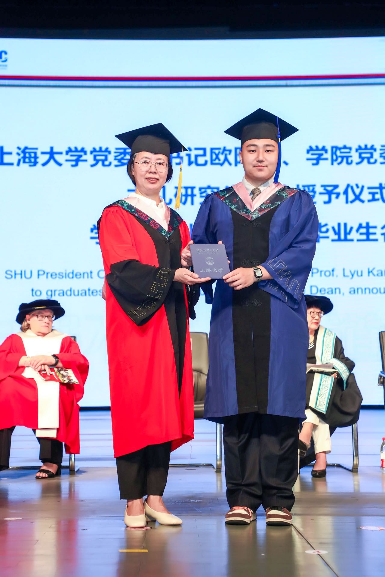一段毕业生自编自导的2023届毕业视频《少年乘风破浪 梦想再启新航》播放之后,毕业生学位授予仪式开始。校党委副书记欧阳华、学院党委书记吕康娟主礼研究生学位授予仪式,学院副院长方慧宣读毕业生名单。悉尼科技大学副校长Vicki Chen、学院院长卞亦文主礼本科生学位授予仪式,学院副院长胡笑寒宣读毕业生名单。