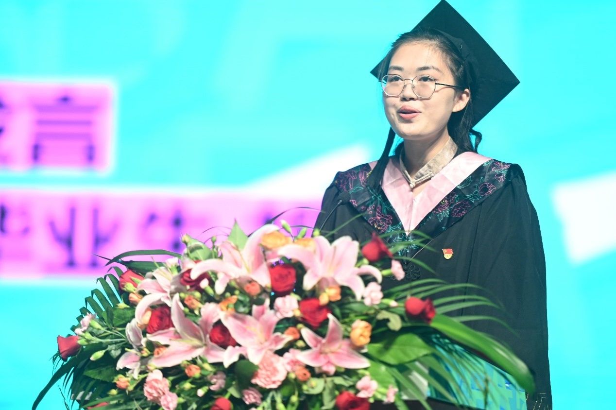 在庄严的国歌声中,毕业典礼正式开始。2023届国画专业本科毕业生胡雅歌代表本科生发言,她回忆了在美院国画系求学四年的所见所闻、所思所感,对于未来,她希望大家都能怀有足够的勇气去面对未知的挫折,追逐梦想,在未来的人生道路上乘风破浪,不坠青云。